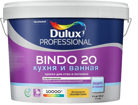 DULUX Professional Bindo 20 5302492 база BW — полуматовая интерьерная краска для стен и потолков. Предназначена для окраски в помещениях с умеренной влажностью: спальня, гостиная, столовая, холл, коридор. Хорошо ложится на бетонные, оштукатуренные, кирпичные основания, гипсокартон, ДВП, на обои под покраску.