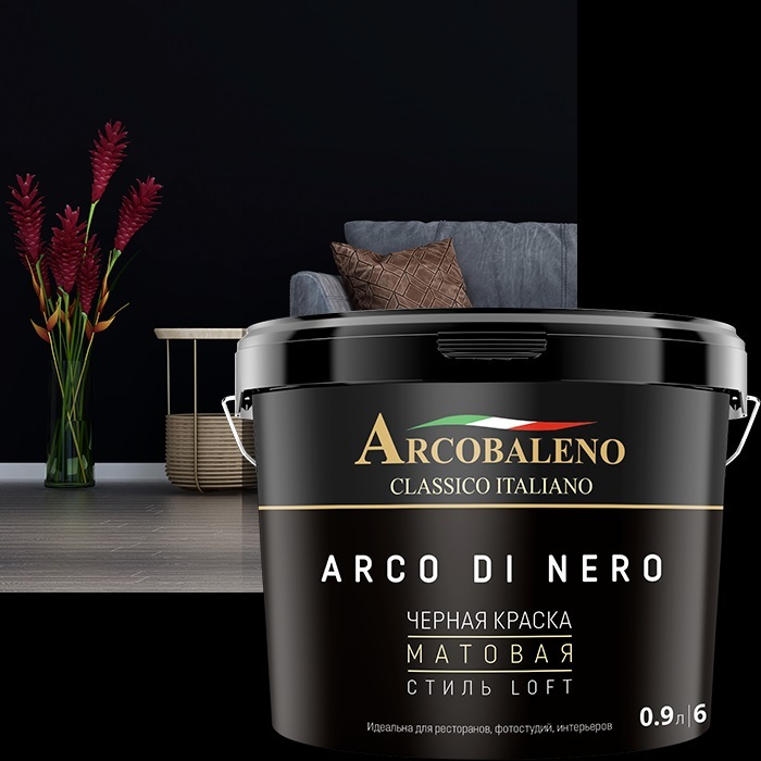 Преимущества: Великолепный абсолютно черный цвет подчеркнет элегантность и стиль помещения. Краска Arco di Nero тотально черного цвета образует матовое покрытие, прекрасно подчеркивая изысканность предметов декора и обстановки жилых и коммерческих интерьеров. Отлично подойдет для интерьера в стиле лофт
